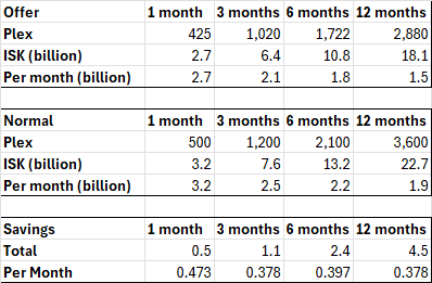 If i did what i used to do which was to buy 3 months of Omega i would be spending 7x6.2x1200/3 = 17 billion isk a month. So the 20% discount and 12 month purchase was a good deal.